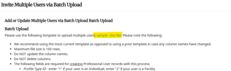 - The following fields are required for creating Professional User records with this process: ○ Profile Type ID - enter “1” if your user is an Individual, enter “2” if your user is a Facility